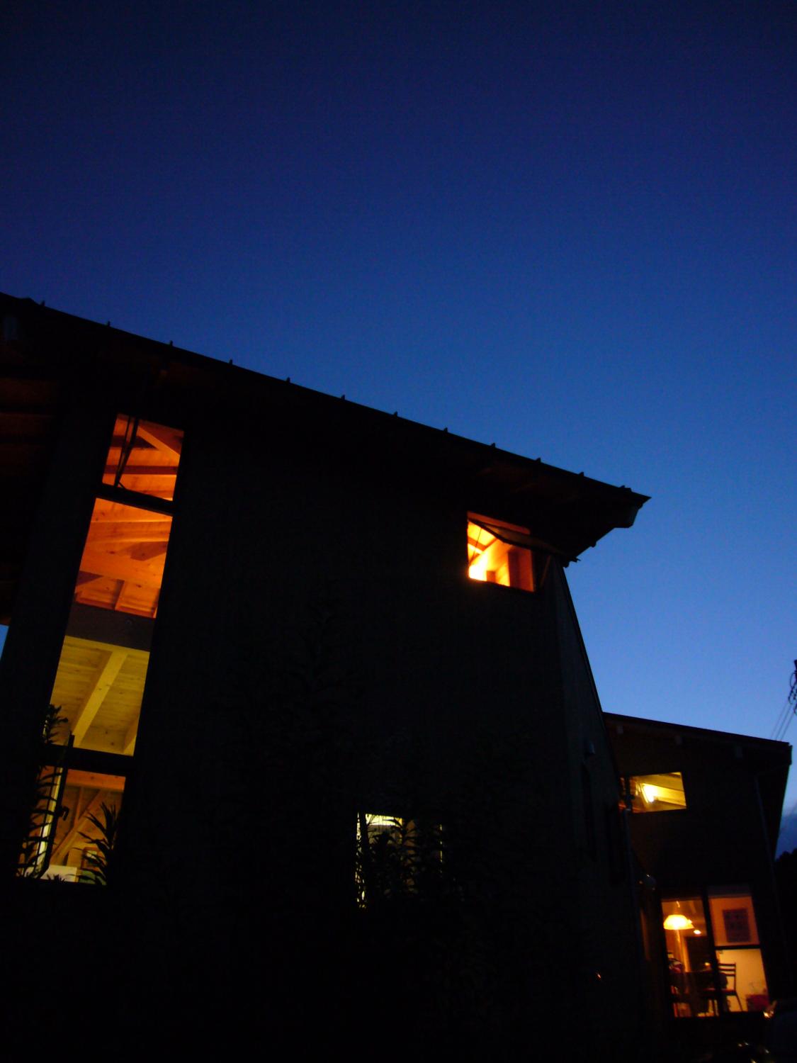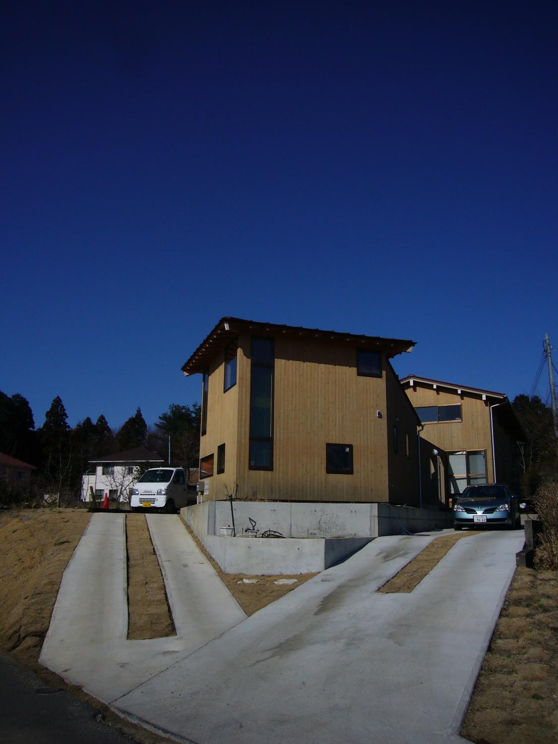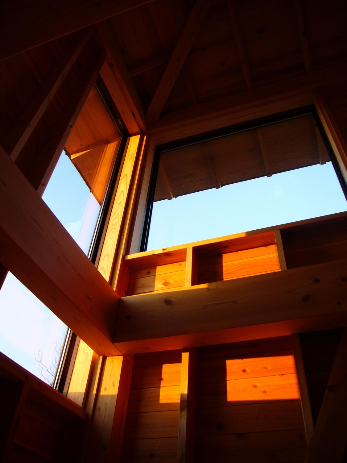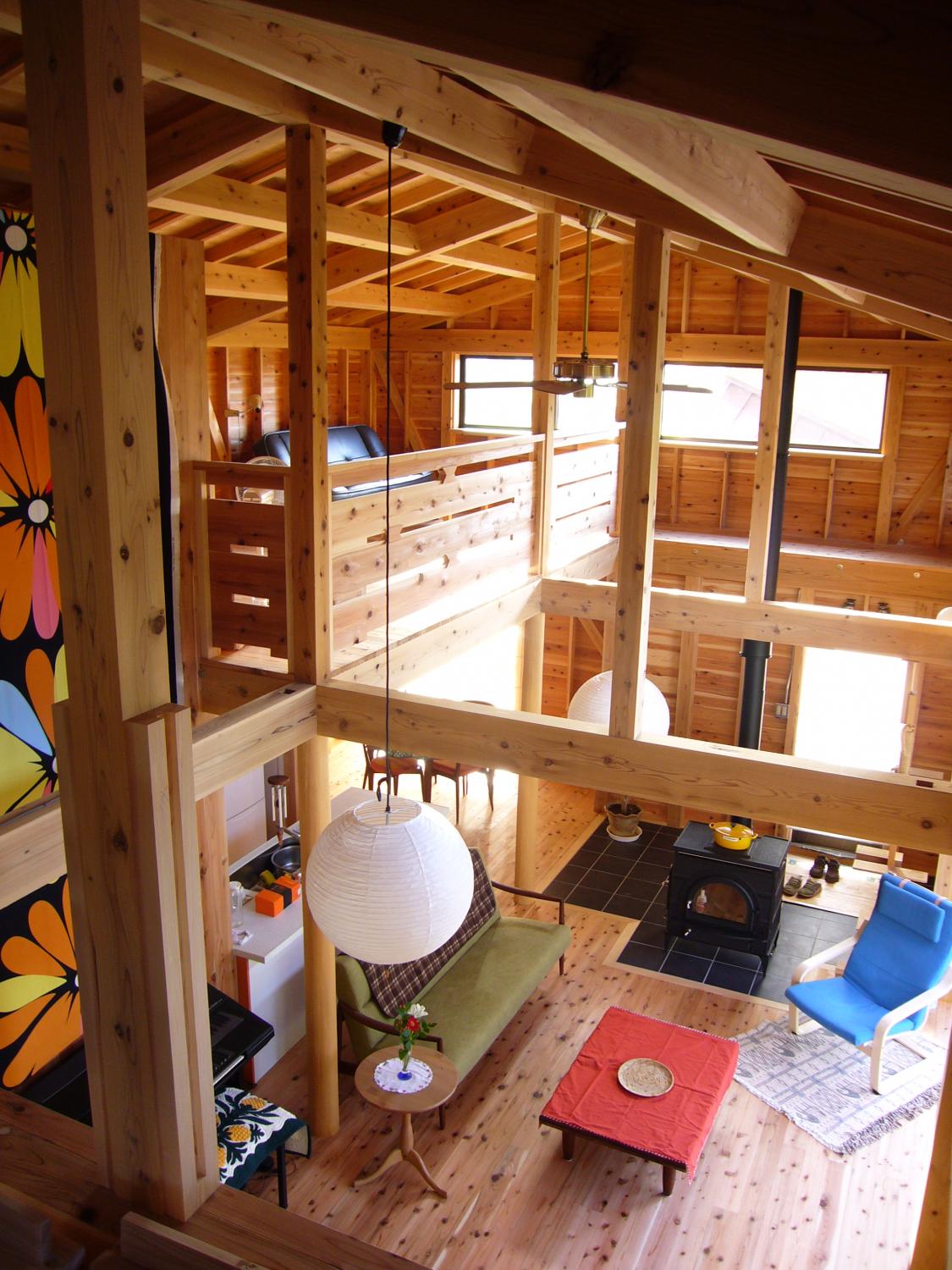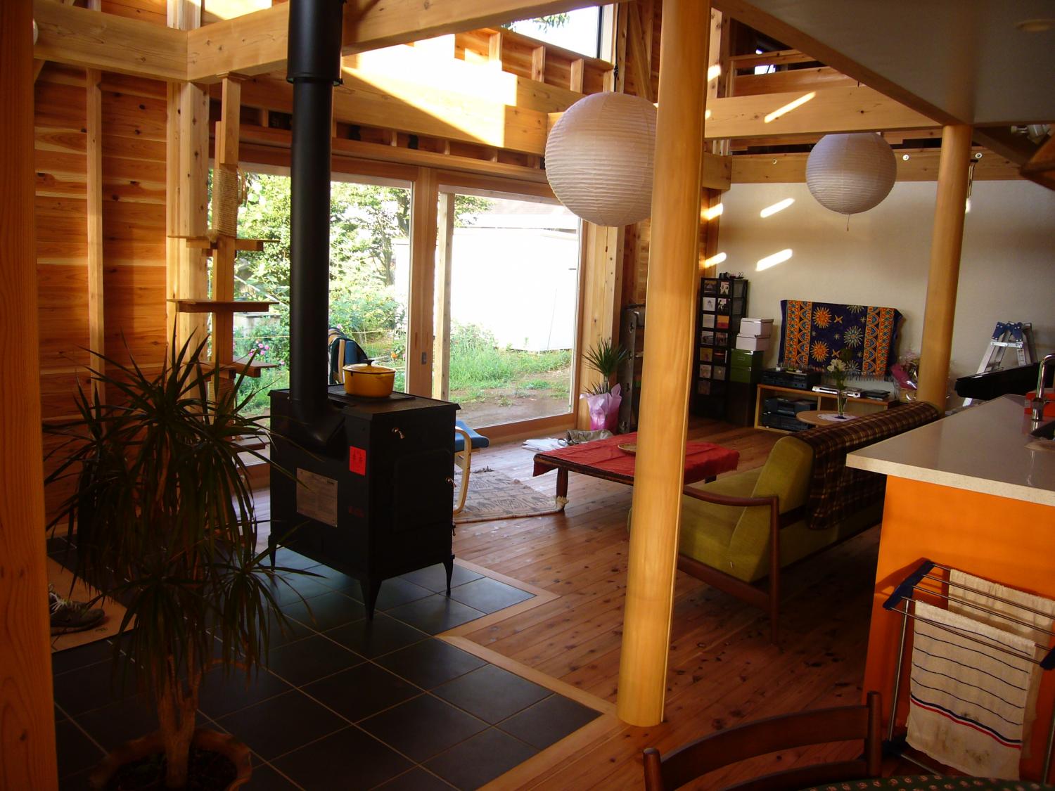 敷地は東海村郊外の小高い丘の上、周辺には雑木林が残る場所です。一年中陽当りが良く、夏には東に広がる水田から冷気を乗せた風が家の中を気持ちよく吹きぬけていきます。差し込む朝日に季節の移り変わりを感じ、夜、吹き抜けの窓を見上げると月が横切っていきます。日常の中にハッとする瞬間があり、ここに居るだけで幸せと感じられる家になりました。家の暖房には薪ストーブを使用しています。