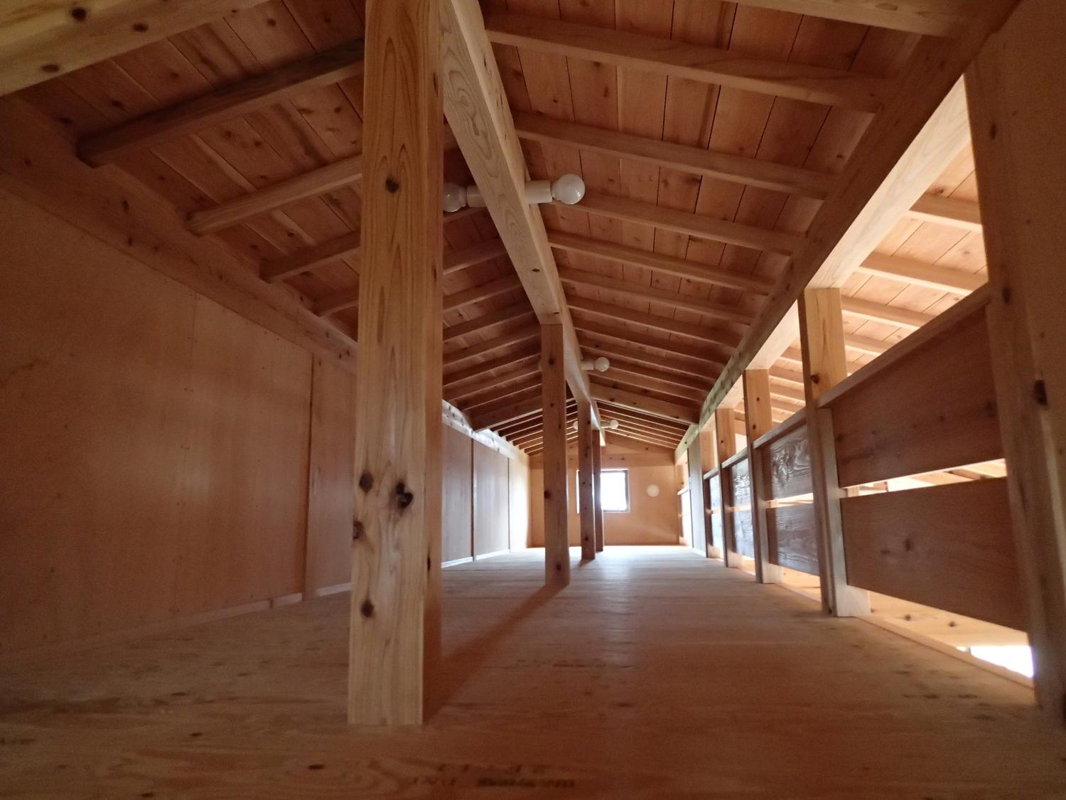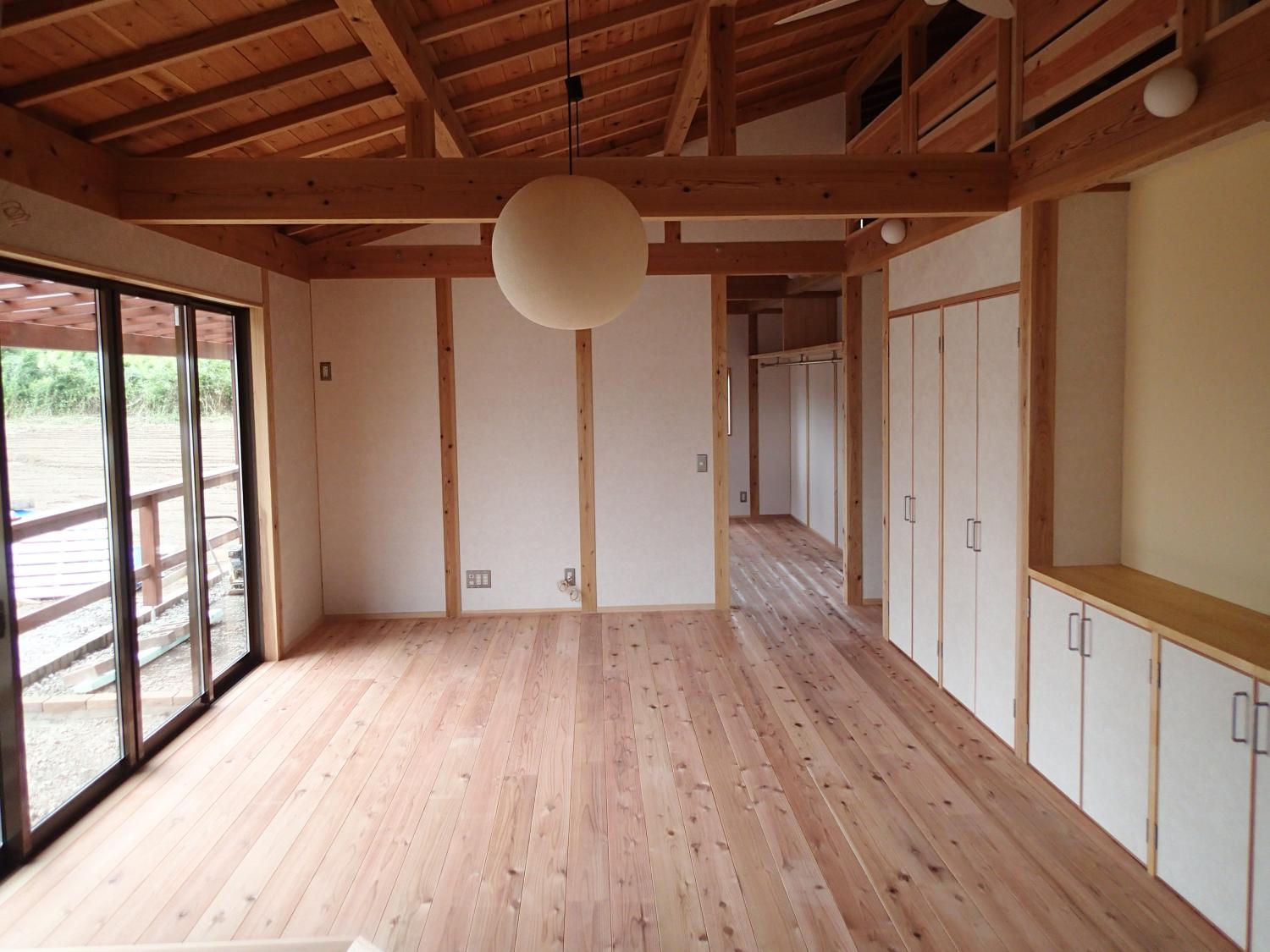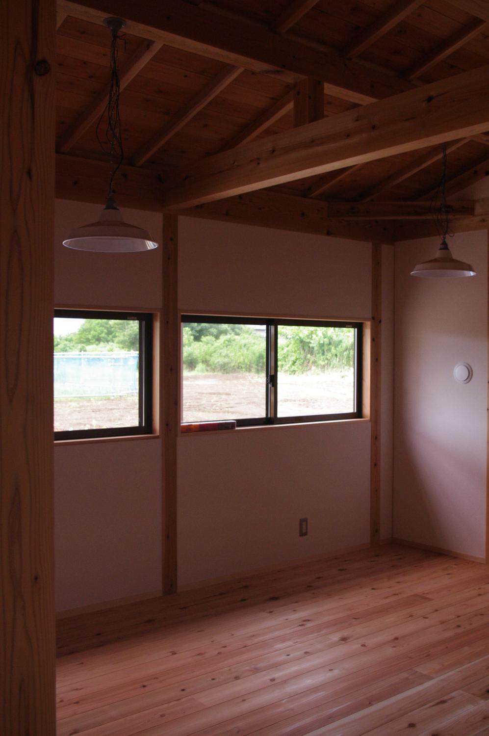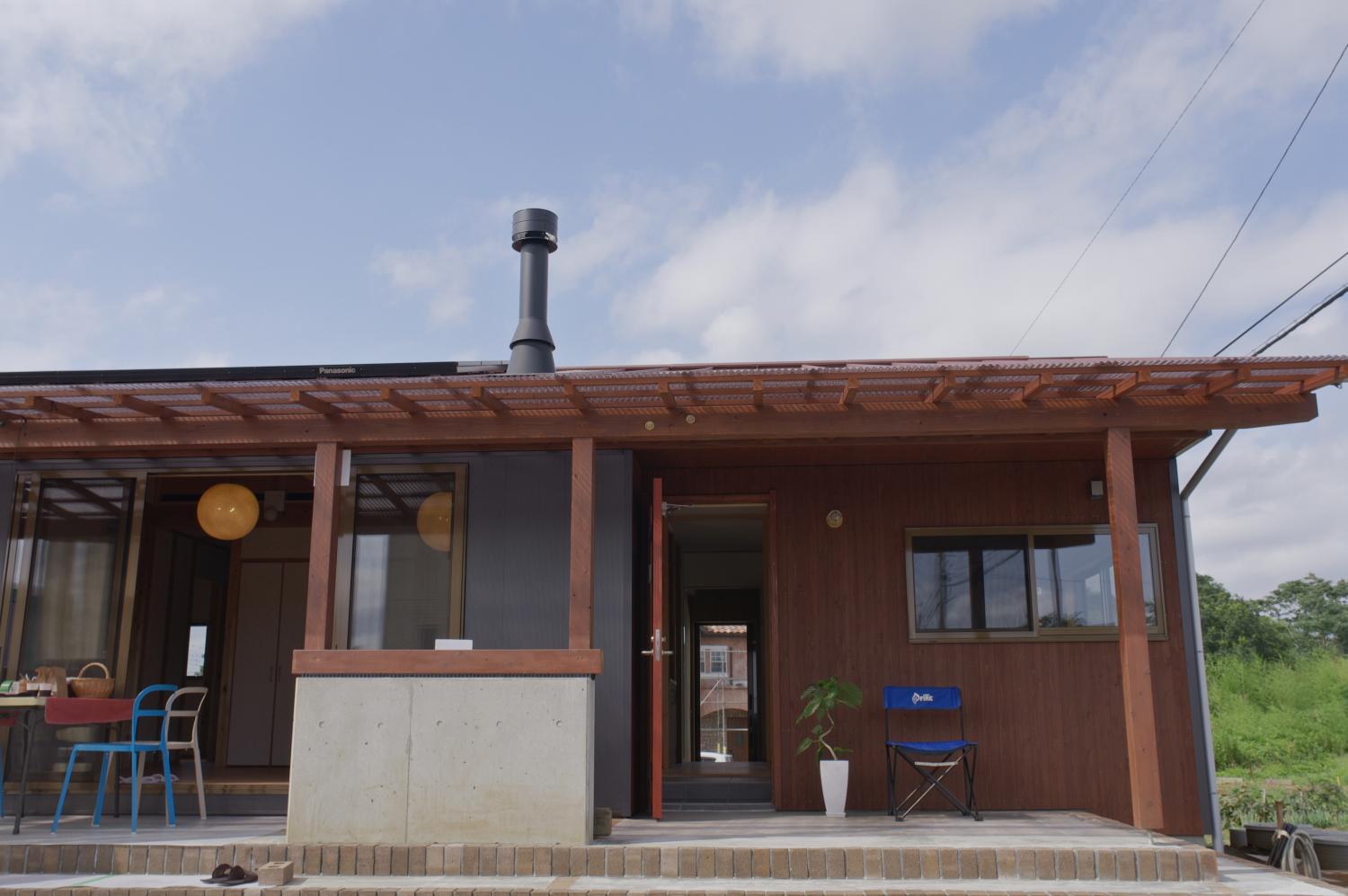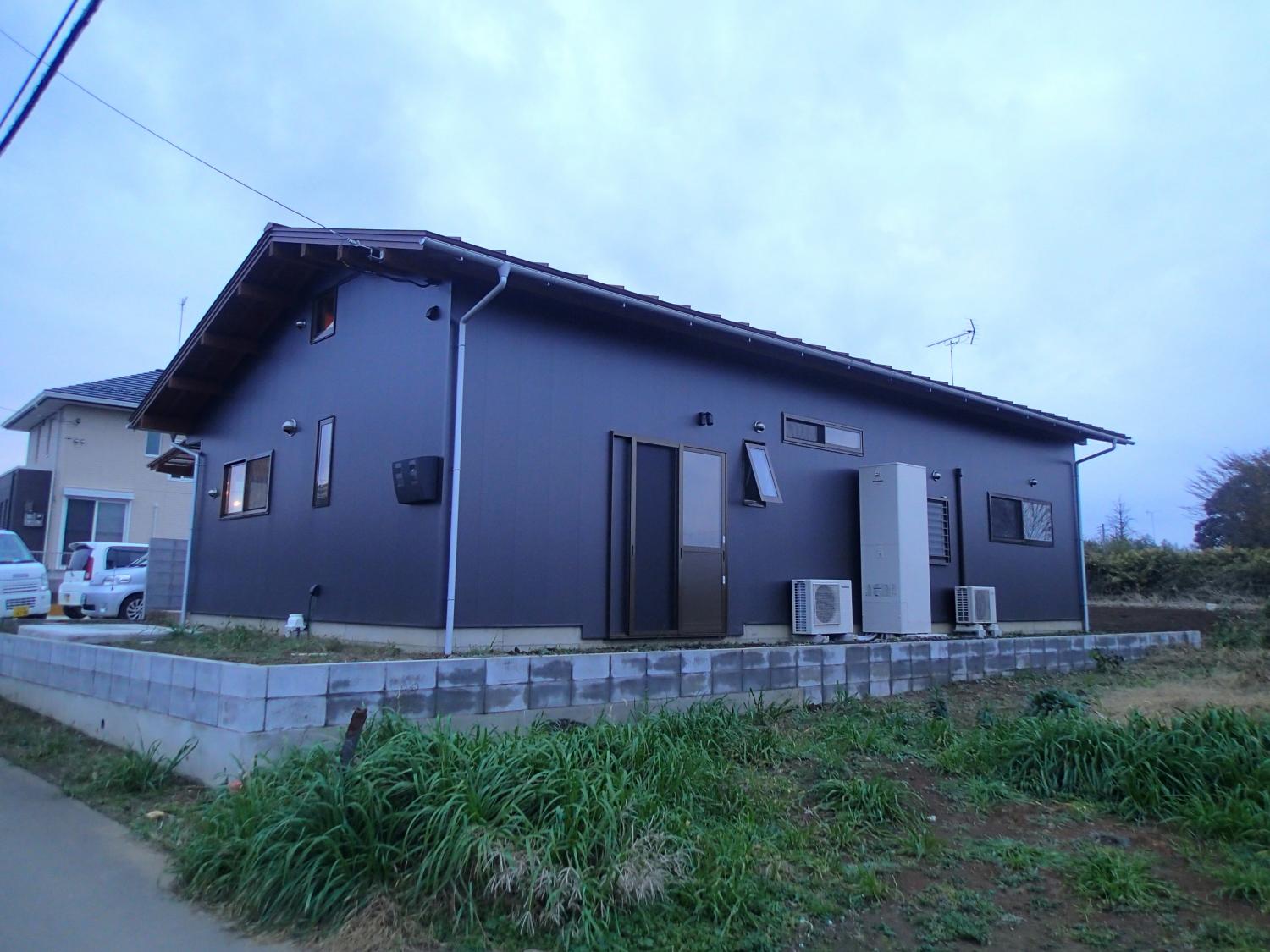 石岡市郊外、周辺に畑や緑が点在している敷地。杉の井の家は敷地を一緒に探すところから始まりました。陽当り良好な敷地にシンプルな切妻屋根、シンプルな動線の平屋の建物を設計しました。全長13mのロフトは大きな収納としてだけでなく、夏には空気の流れをつくる大きな換気装置として働きます。深い庇のテラス、キッチン裏の土間物置などが若いご家族の楽しい生活を、より自由にしてくれます。家の断熱は、冬に薪ストーブ1台で暖かく過ごせるように設計しています。