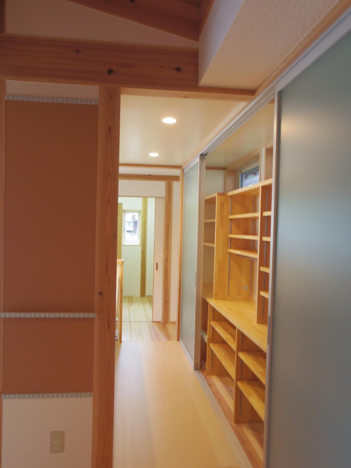 日立市市街、南面に緑や河川を感じられる敷地。この計画は敷地を一緒に探すことから始まりました。ご家族と愛猫のためのお家は、家事動線上にしっかり閉じられる、たっぷりの収納や1階から2階へ猫が自由に回遊できる猫道など快適に暮らし遊ぶ仕掛けがいっぱいです。SEED設計室の自宅にも猫がいるため、打合せの際には、猫の行動や遊び方、通り道などについて細かな内容のお話ができました。大きな庇のテラスが来る人をゆったりと迎えます。